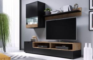 - 1 x тумбы под ТВ (в / ш / г - 34/175/39 см) состоит из одной дверной части, откидной створки и двух углублений для аудио и видео оборудования;