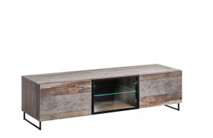 Тумба ТВ PLANK: 2 стандартные двери для каждого отсека. Посередине дверь застеклена черной алюминиевой рамой, за ней стеклянная полка со светодиодной подсветкой. Ножки из черного металла.
