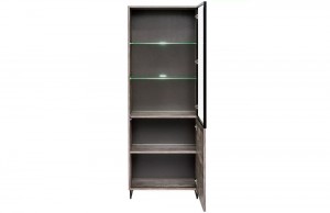 Витрина высокая PLANK: застекленная дверь. За ними две стеклянные полки, освещенные светодиодной подсветкой. Ниже стандартной двери, за ней одна стандартная полка (2 места). Черные алюминиевые стеклянные рамы. Ножки из черного металла.
