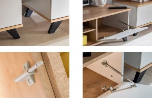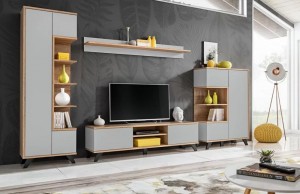 Высокая витрина: 3 полки (4 места), открытые спереди и с правой стороны корпуса. Большая левая дверца, открывающаяся нажатием кнопки, за ними 4 полки (5 мест). Справа, вверху и внизу, дверца открывалась нажатием кнопки, за ними одно отделение. Низкий стоящий экран: 1 полка (2 места), открытая спереди и с левой стороны корпуса. Правая большая дверь открывается нажатием кнопки, за ними 2 полки (3 места). Справа вверху и внизу дверца открывалась нажатием кнопки, за ними одно отделение. Тумба для ТВ: справа и слева створки открывались нажатием кнопки, за ними - одна. отсек. Два открытых отделения посередине Подвесная полка.