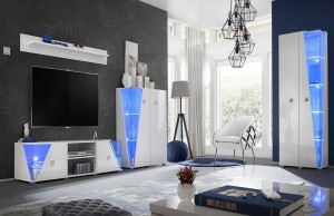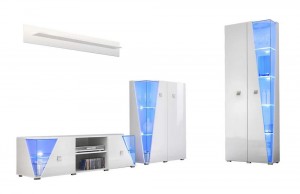 Высокий шкаф: одна дверь, боковые и верхняя часть частично застеклены. Одна обычная дверь. За ними 4 стандартные полки и 4 стеклянные полки со светодиодной подсветкой. Полка Низкая ширма: Одна дверь, боковые и верхняя часть частично застеклены. Одна обычная дверь. За ними 2 стандартные полки и 2 стеклянные полки с подсветкой светодиодной подсветкой. Телевизионный шкаф: борта, столешница и частично застекленная дверь, за дверью две камеры со стеклянной полкой с подсветкой светодиодной подсветкой. Посередине находится отсек со стандартной полкой. Металлические ножки.