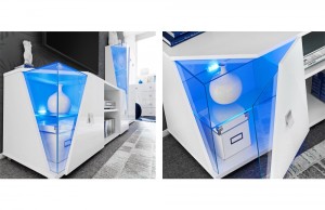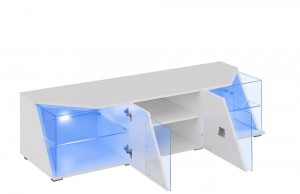 Тумба ТВ: борта, столешница и частично застекленная дверь, за дверью две камеры со стеклянной полкой, освещенной светодиодной подсветкой. Посередине находится отсек со стандартной полкой. Металлические ножки.
