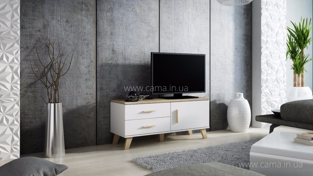 Тумба RTV ЛОТТА 120 1D2S имеет одну дверку, которая открывается в сторону, и два аккуратных ящика