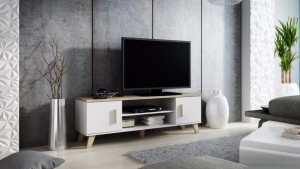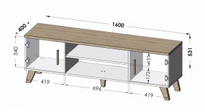 Тумба RTV ЛОТТА 160 2D2K имеет два открытых отсека, и две ниши с дверками. Внутри шкафа находятся две вместительные полки.
