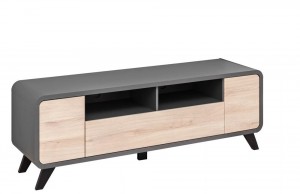 Тумба ТВ ROUND: Справа и слева дверь открывалась нажатием кнопки, за ними одно отделение. В центре вверху два открытых отделения, под двойным ящиком на общей передней панели. Корпус с загнутыми краями.