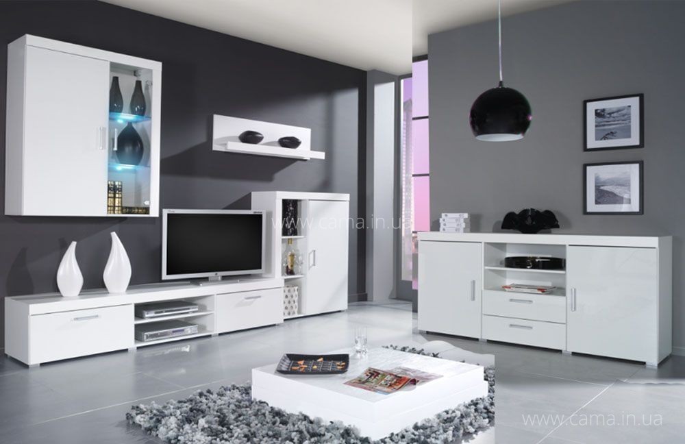 Пример компоновки гостиной из модулей коллекции Samba CamaВ комплект входят - тумба ТВ + навесная витрина + напольная витрина + полка+ широкий комод