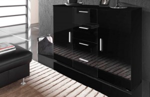 По бокам распашные, глянцевые фасады. По центру выдвижные ящики - 4шт.