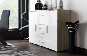 По бокам распашные, глянцевые фасады. По центру выдвижные ящики - 4шт.