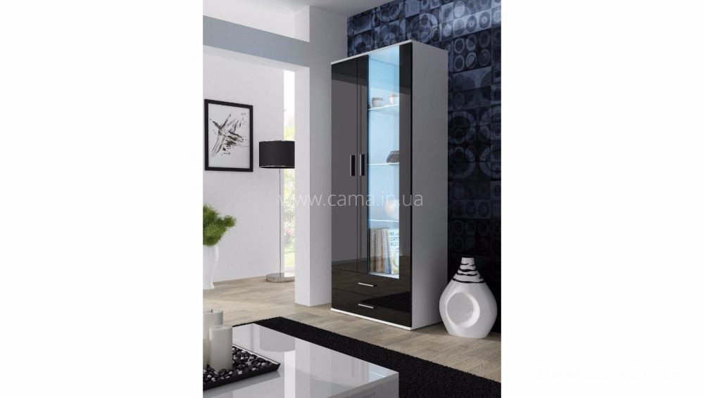 Один фасад глянцевый со стеклом, внутри три стеклянные полки с возможностью установки 3 Led подсветки, второй фасад глухой,глянцевой,внутри три полки обычные, внизу два выдвижных ящика, фасады в глянцевые, установка дверей универсальная ( право/лево).Подсветка не входит в комплект поставки.