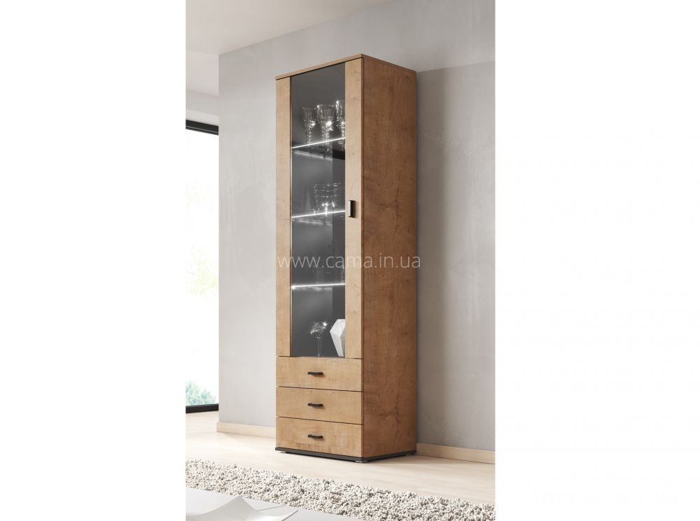 Верхняя часть витрины типично декоративная – предназначена для размещения декоративных мелочей. В свою очередь, в нижней части оборудованы три вместительных выдвижных ящика.