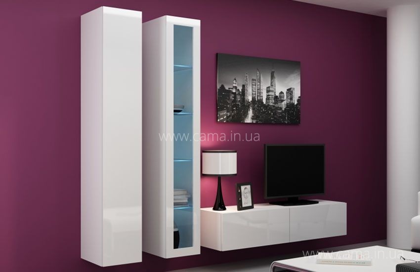 Гостиная Vigo 10 хороша тем что в ней есть и глухой пенал и витрина с стеклянным фасадом.