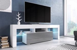 Cama TORO тумба для телевизора 138 см шириной, спереди открывается вниз, за дверкой находится ниша для техники, так же есть две стеклянные полки, с возможностью подключения подсветки.