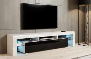 Черно-белая тумба под телевизор TORO 200 прекрасно подойдет для гостиной или спальни. Ламинированная плита МДФ не только эффектно выглядит, но и обладает выдающимися эксплуатационными характеристиками. Высокая прочность снижает риск преждевременного повреждения или износа. Кроме того, очистка поверхности не является трудоемкой задачей. Черно-белая тумба под телевизор TOTO 200 создаст атмосферную атмосферу и скрасит интерьер.